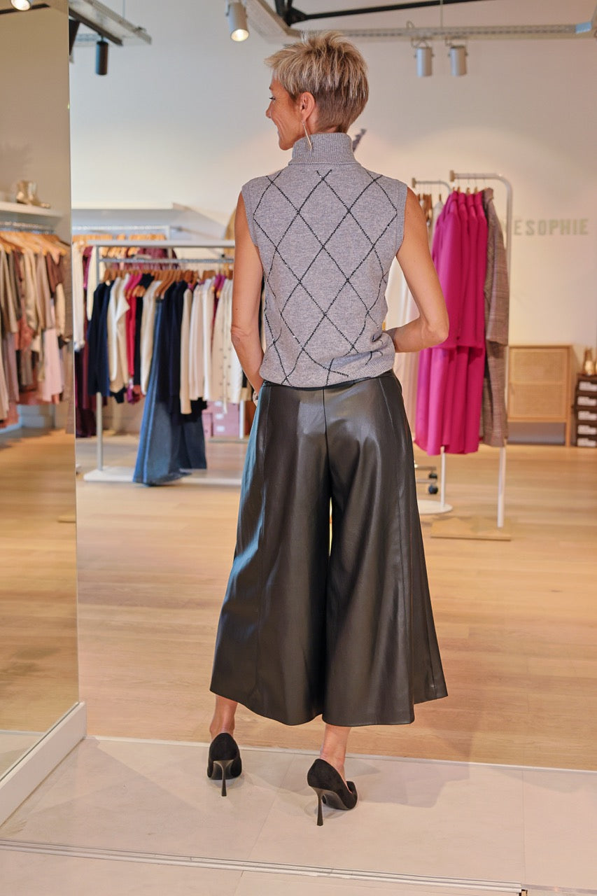 Le bermuda Élyane noir revisite le style urbain avec une touche sophistiquée. Sa matière en simili cuir apporte caractère et modernité, tandis que sa coupe évasée assure confort et élégance. Polyvalent, il se porte aussi bien en journée avec une maille cosy qu’en soirée avec des talons pour un look affirmé.