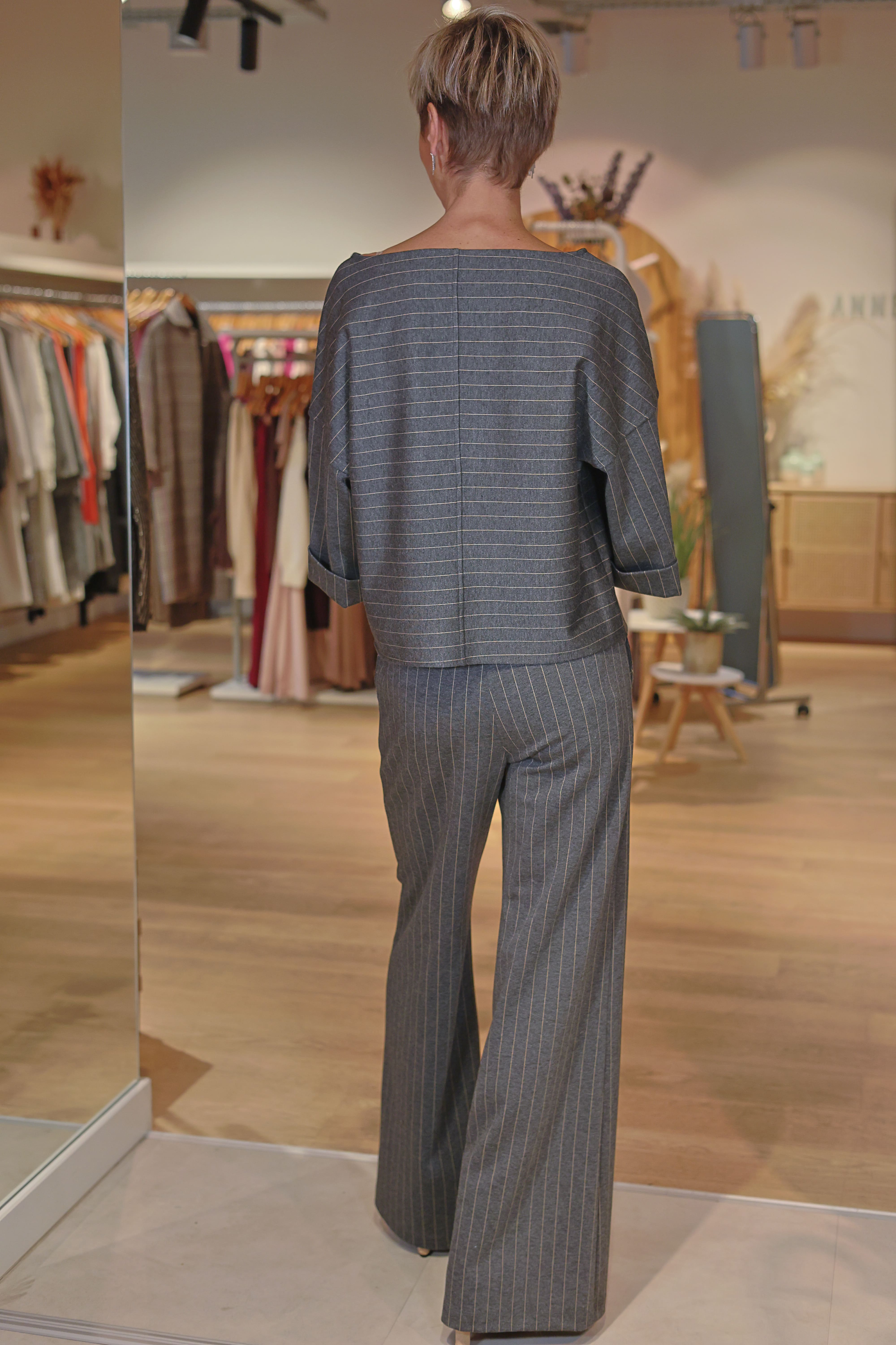 Le pantalon Gigi gris à fines rayures beiges revisite le style tailoring avec une touche contemporaine. Sa coupe large et fluide allonge la silhouette tout en offrant un confort optimal. Confectionné dans un tissu souple et légèrement extensible, il épouse le mouvement sans contrainte. Ses rayures verticales discrètes apportent une note élégante et allongent la jambe pour un effet silhouette élancée.