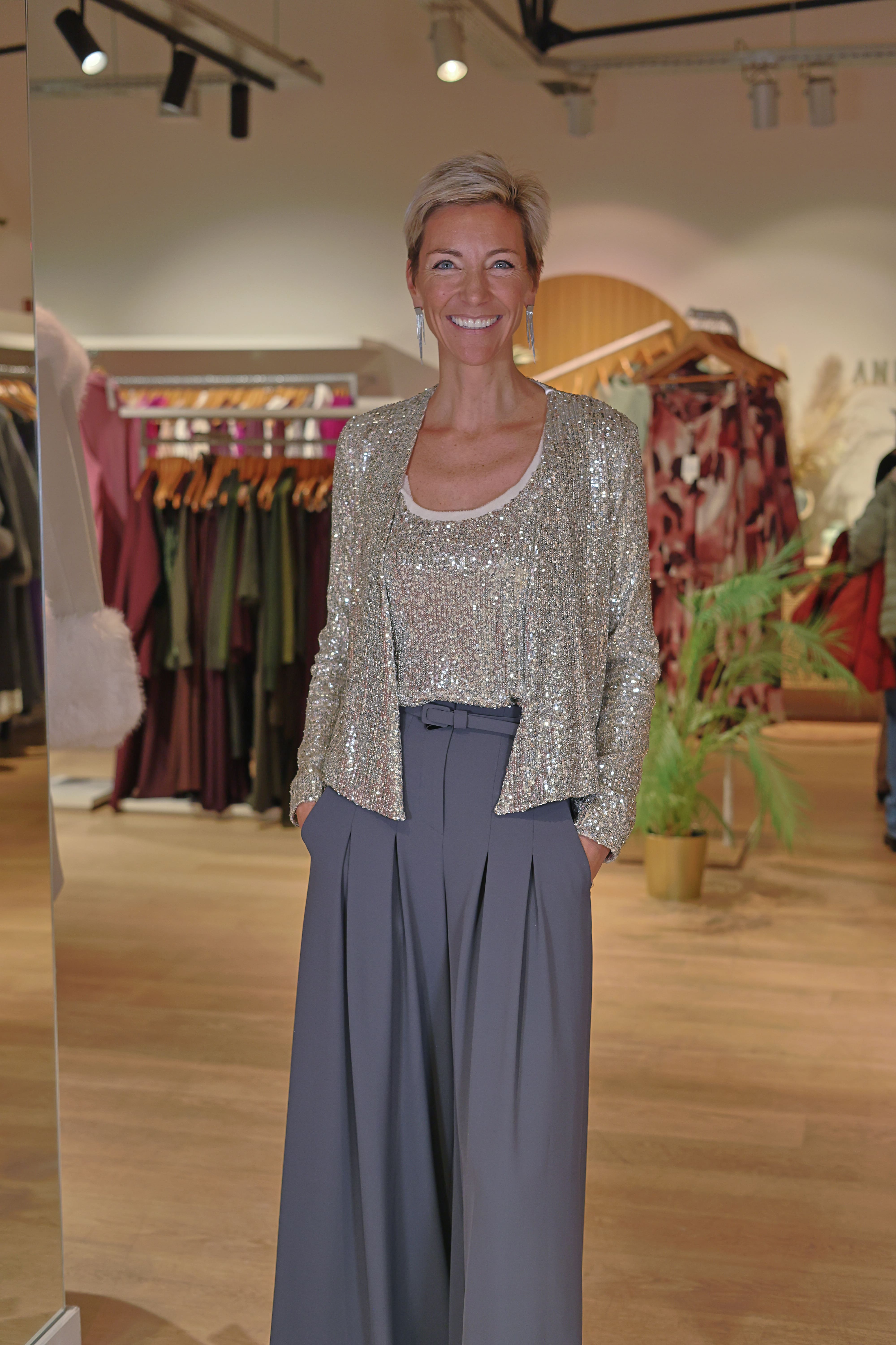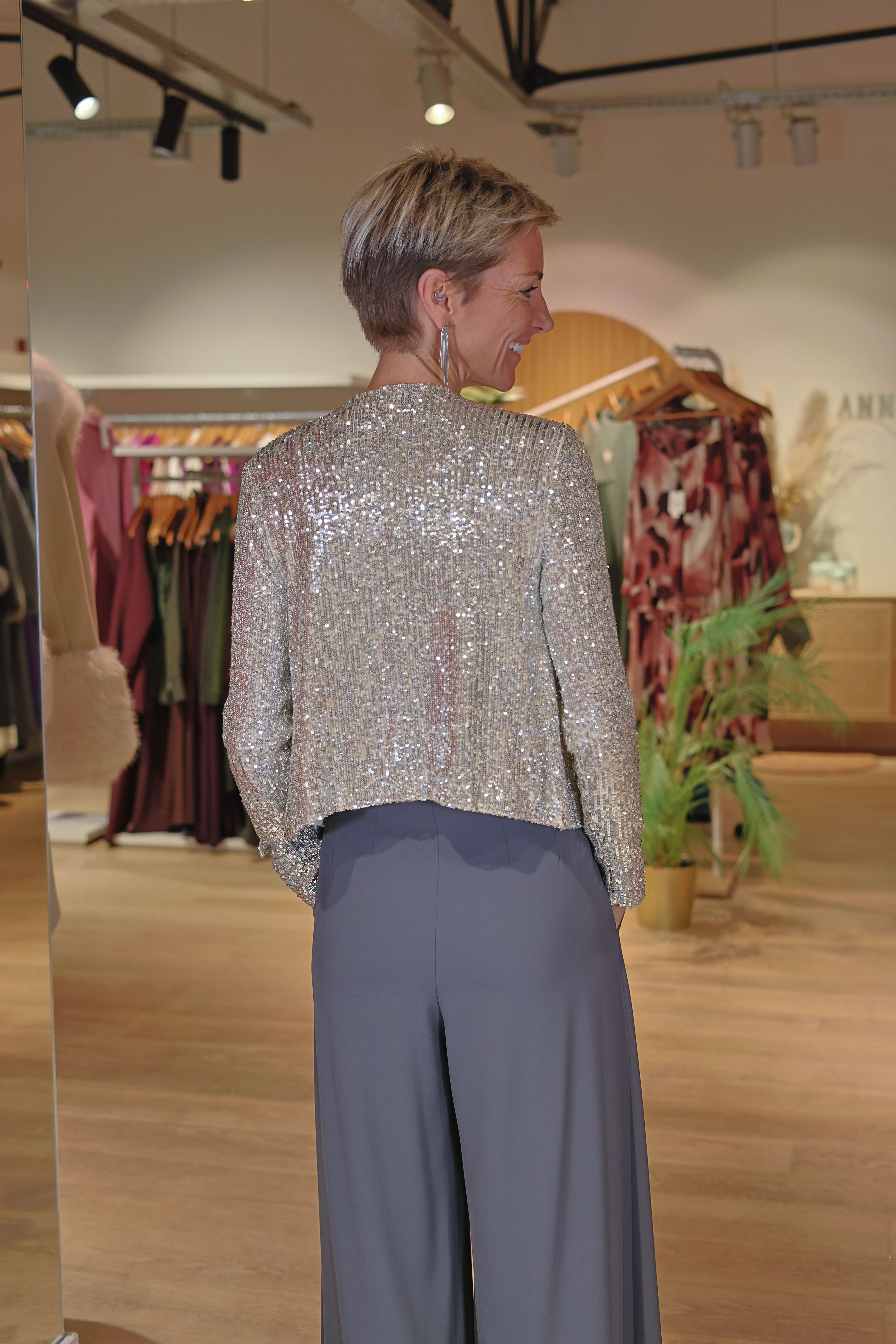 Le Cardigan Katarina argenté illumine immédiatement la silhouette grâce à son fini entièrement recouvert de paillettes scintillantes. Sa coupe fluide apporte élégance et mouvement, tandis que sa luminosité en fait une pièce forte, parfaite pour toutes vos occasions festives. À porter seul ou en ensemble avec le Top Katarina argenté pour un look irrésistible.