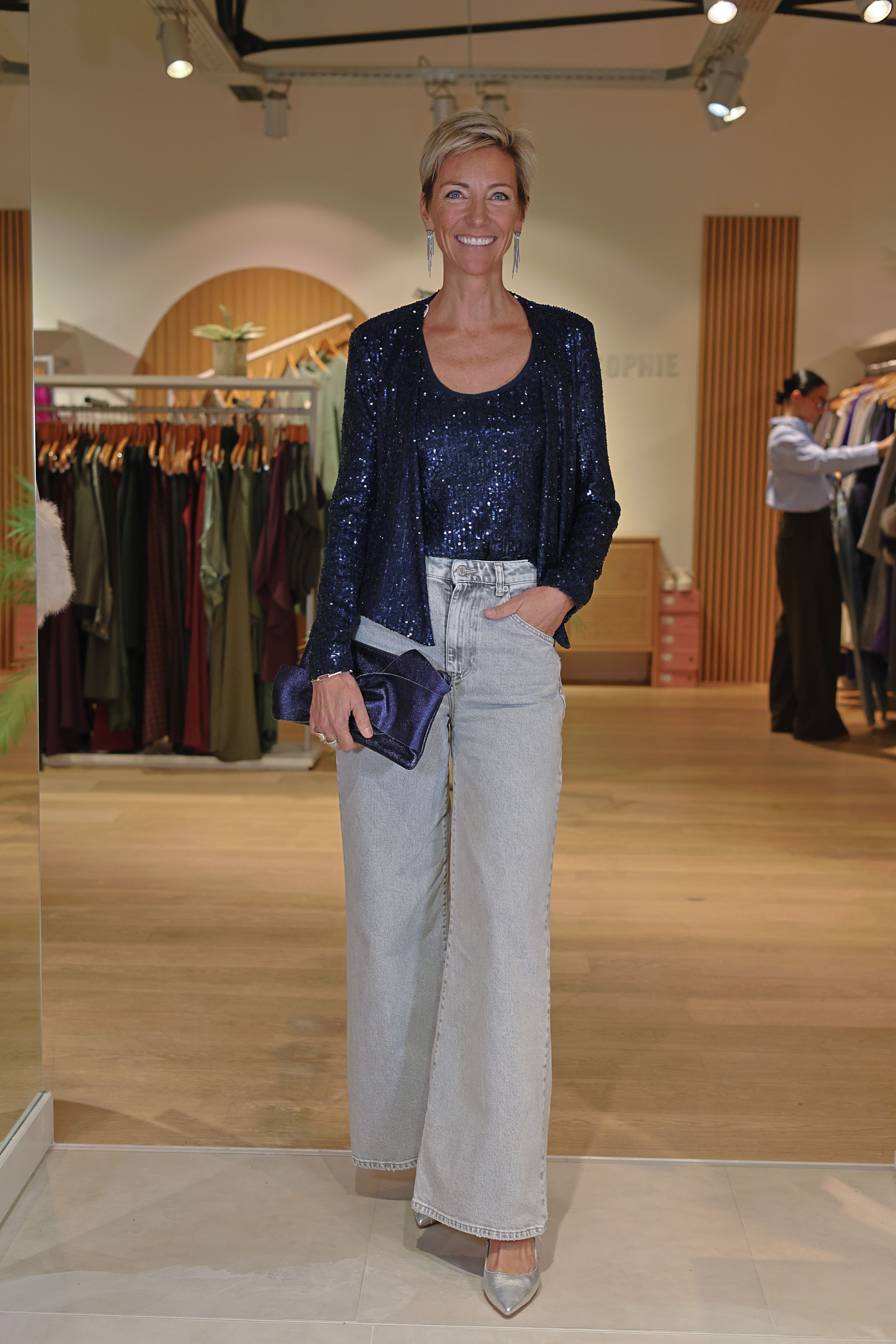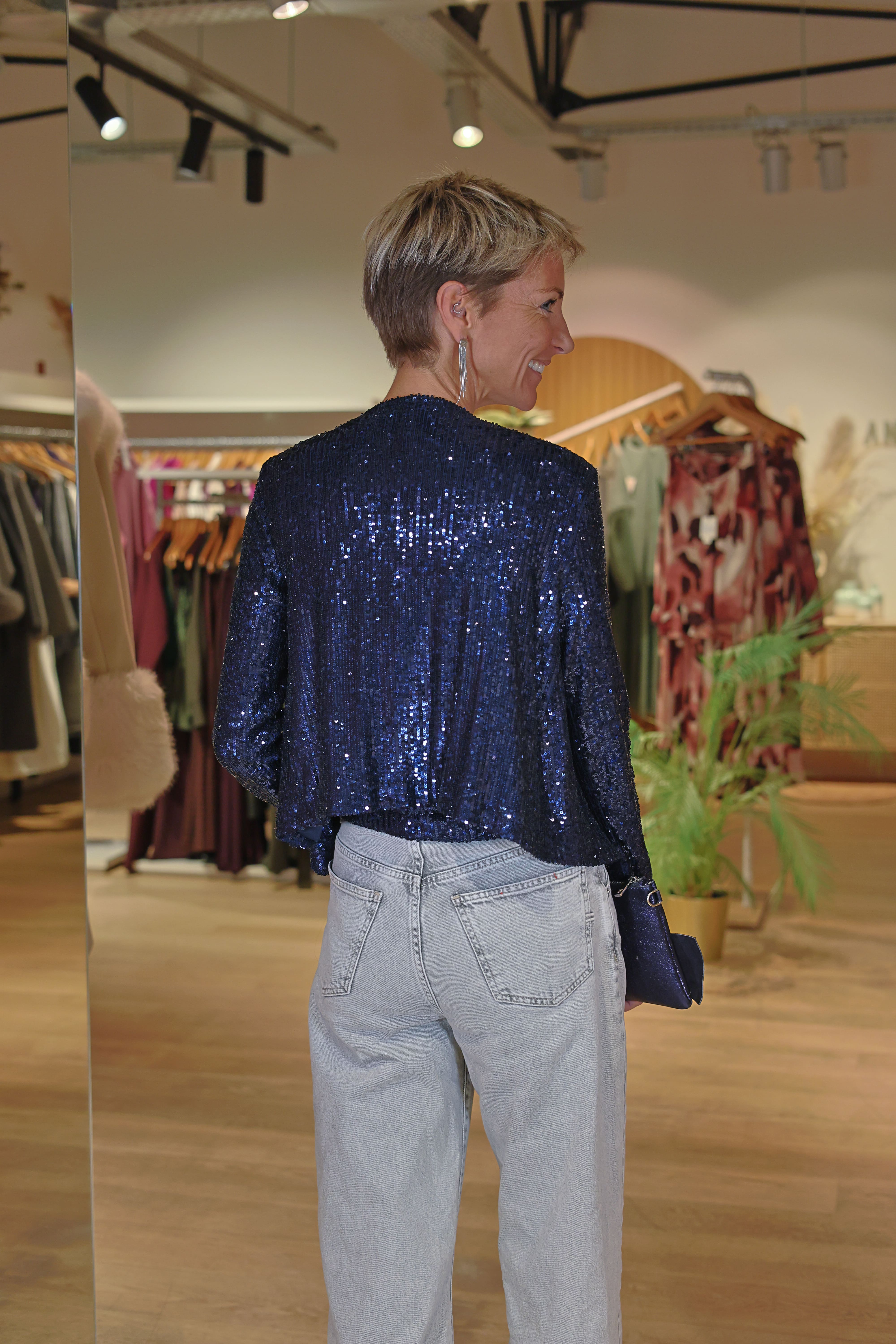 Le Cardigan Katarina bleu marine est la pièce parfaite pour sublimer vos tenues de soirée. Entièrement recouvert de paillettes bleu nuit, il apporte une touche lumineuse tout en restant élégant et facile à porter. Sa coupe fluide et sa matière souple permettent un tombé naturel, idéal par-dessus un top ou une robe. Une veste chic et moderne pour briller avec subtilité.