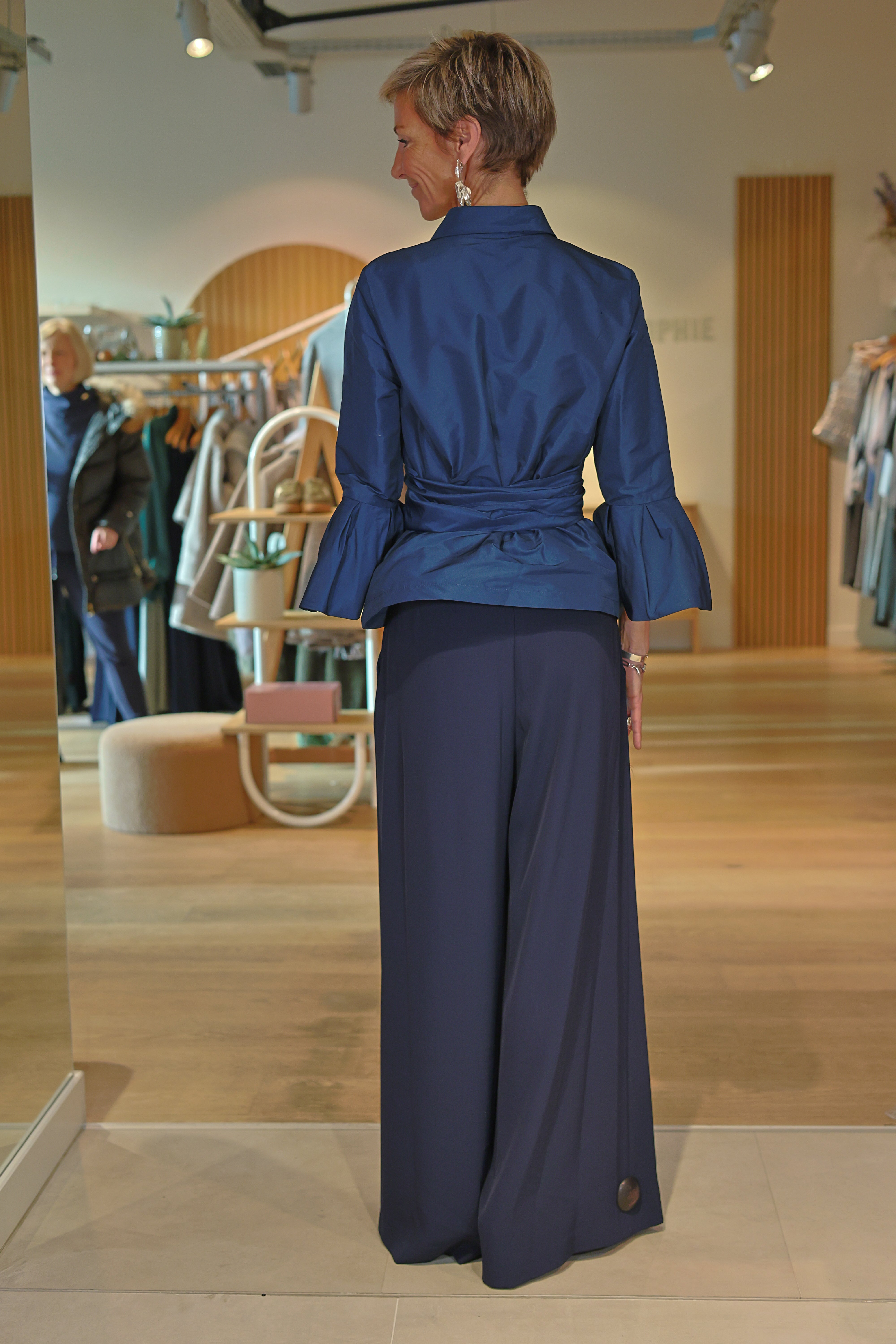 La chemise Roméo bleu foncé offre une allure chic et intemporelle. Son design drapé et sa taille nouéepermettent de marquer subtilement la silhouette tout en apportant une touche moderne. Parfaite avec la jupe Roméo assortie ou un pantalon large.