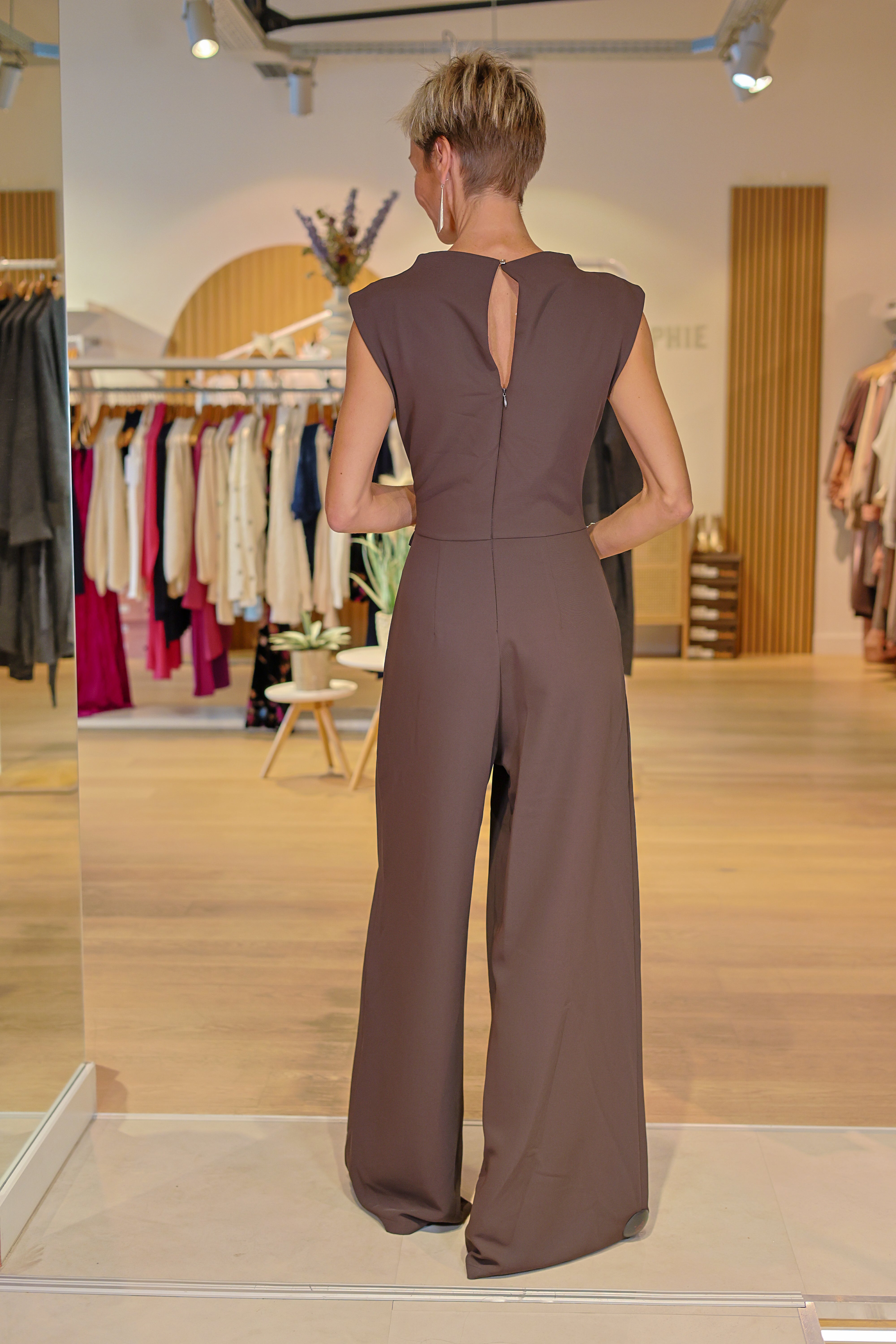 La combinaison Cléo chocolat est la pièce chic par excellence. Sa teinte chaude et profonde apporte une touche de caractère, tandis que sa ligne épurée et sa ceinture élégante structurent la silhouette avec finesse. Un essentiel du dressing féminin.