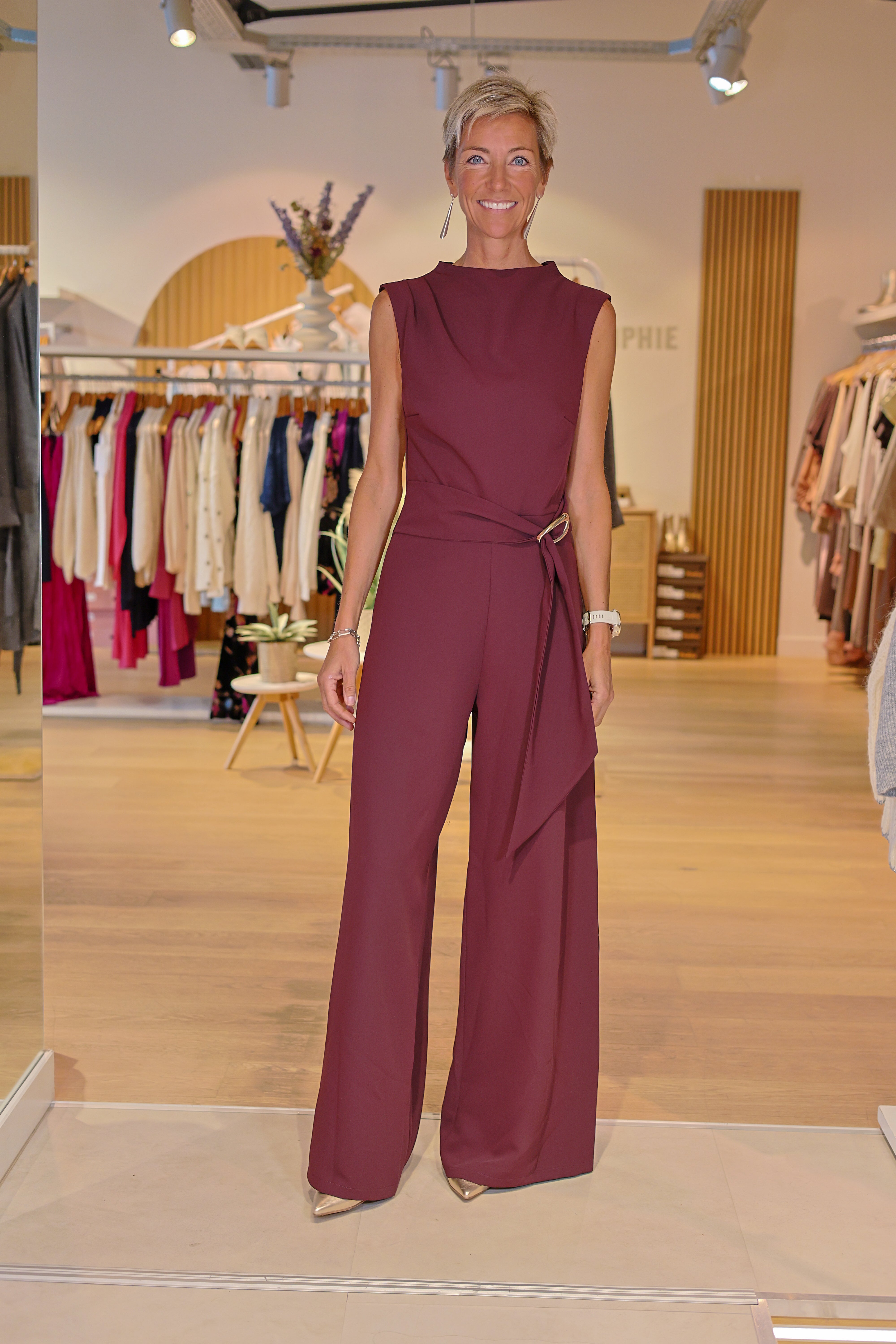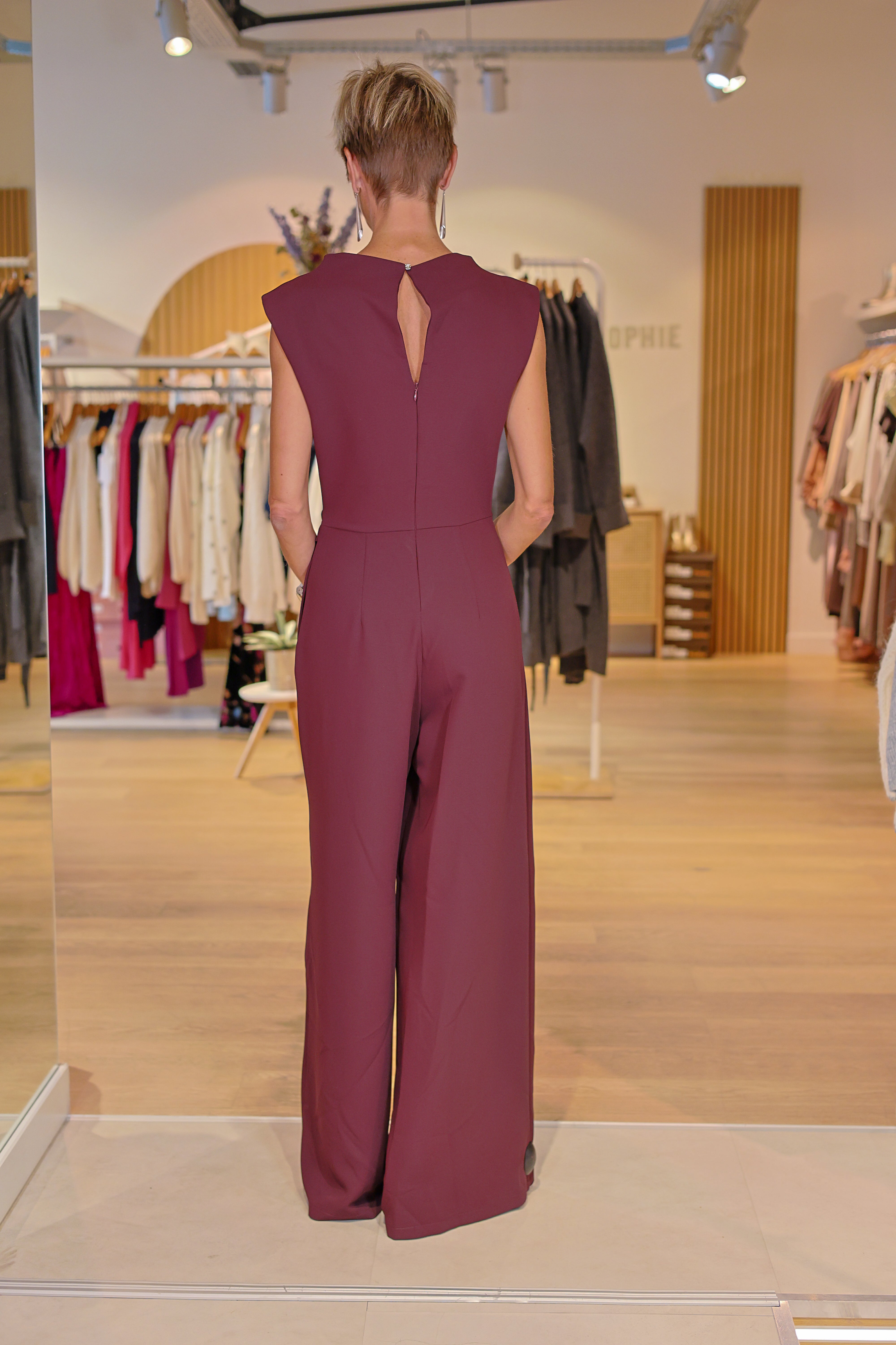 La combinaison Cléo prune incarne l’élégance moderne. Son col montant structuré et sa ceinture à boucle ton sur ton marquent la taille avec subtilité, tandis que sa coupe fluide et sans manches allonge la silhouette. Idéale pour une soirée ou une cérémonie, elle combine confort et allure sophistiquée.