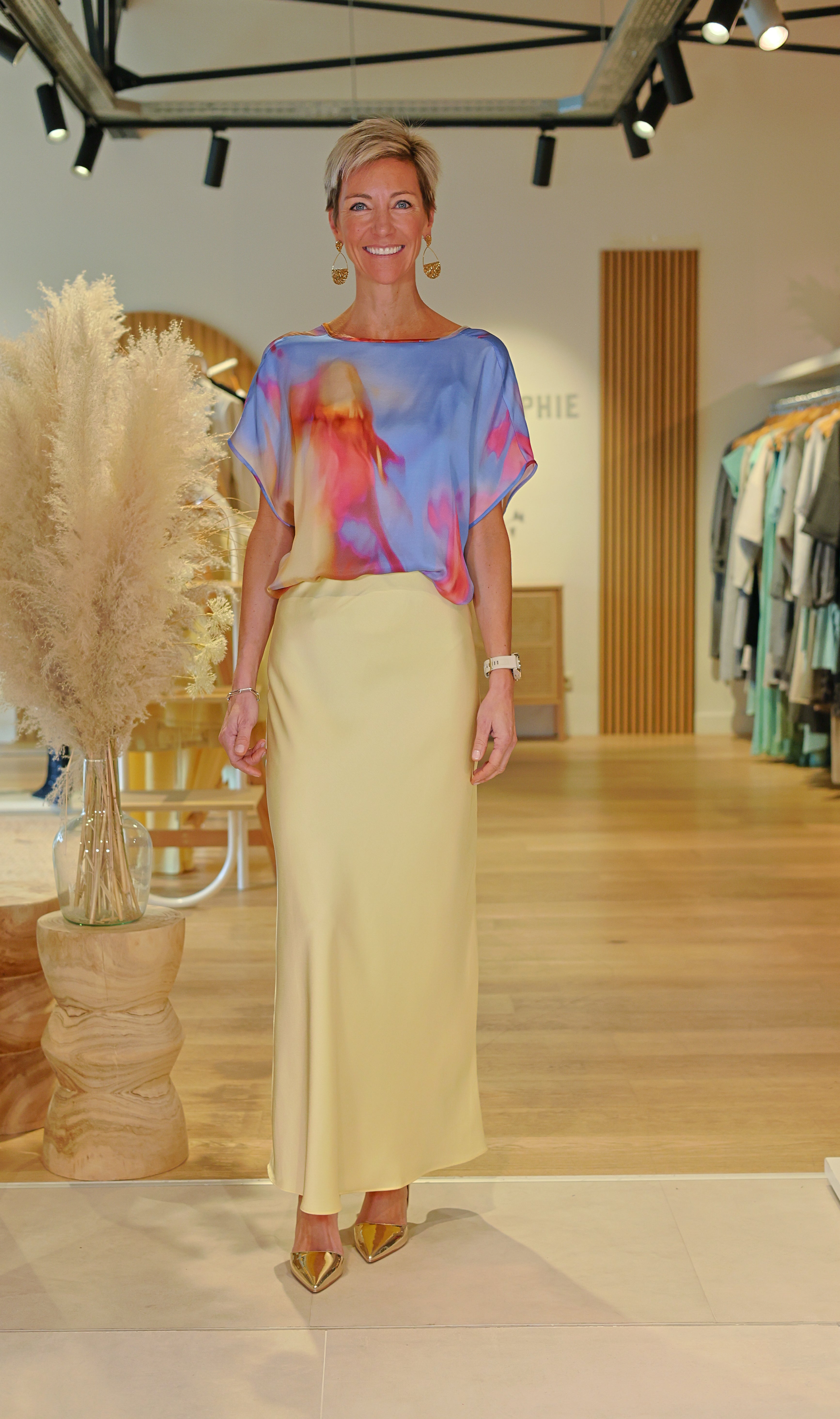 Anne-Sophie porte la taille S, qui convient pour un 34 et un 36.