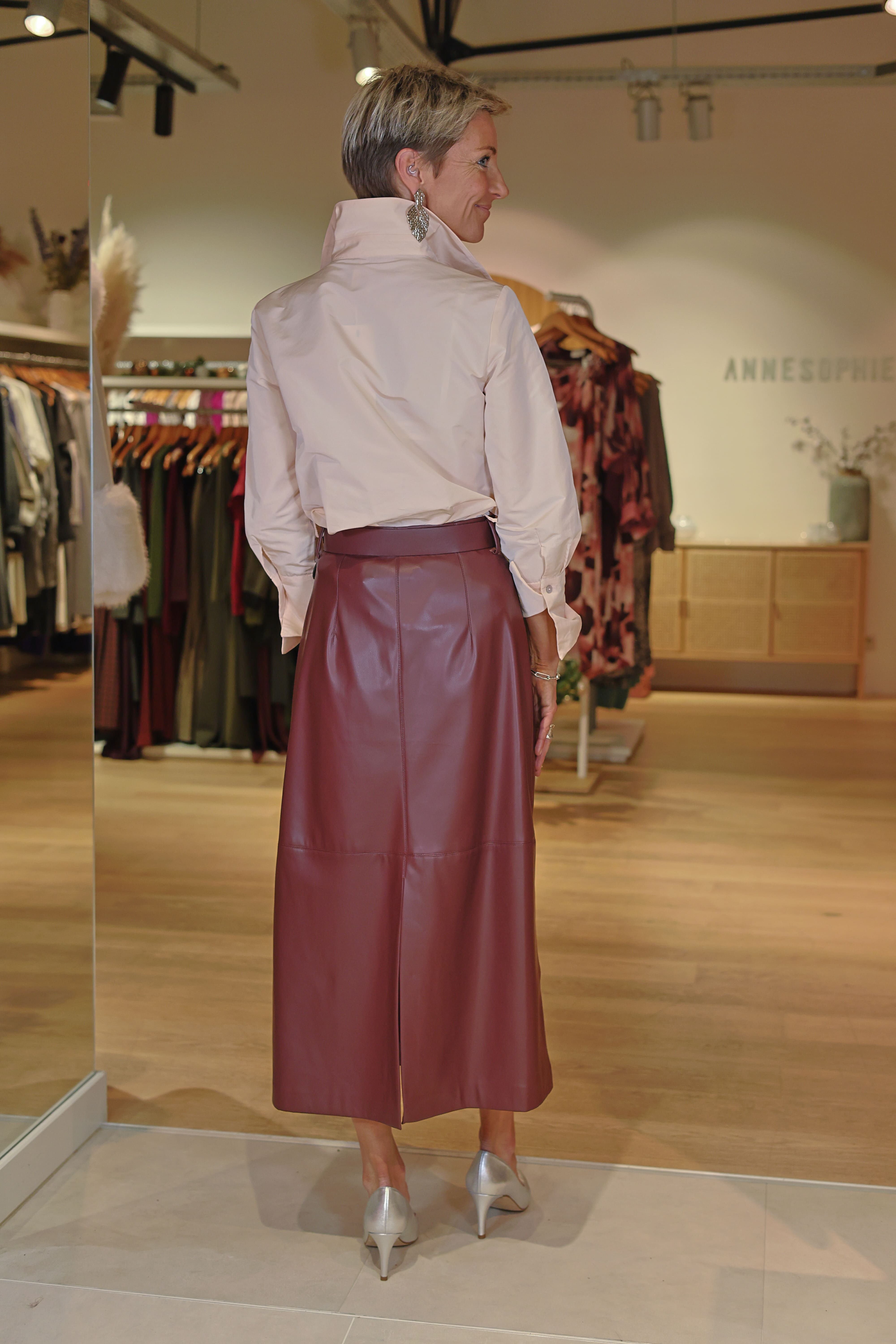 Audacieuse et élégante, la jupe Manoé bordeaux sublime la silhouette grâce à sa coupe longue évasée et sa matière effet cuir haut de gamme. Sa couleur profonde apporte une touche de caractère tout en restant facile à associer. La ceinture ton sur ton, ornée d’une boucle circulaire, souligne la taille et apporte une finition parfaitement maîtrisée.