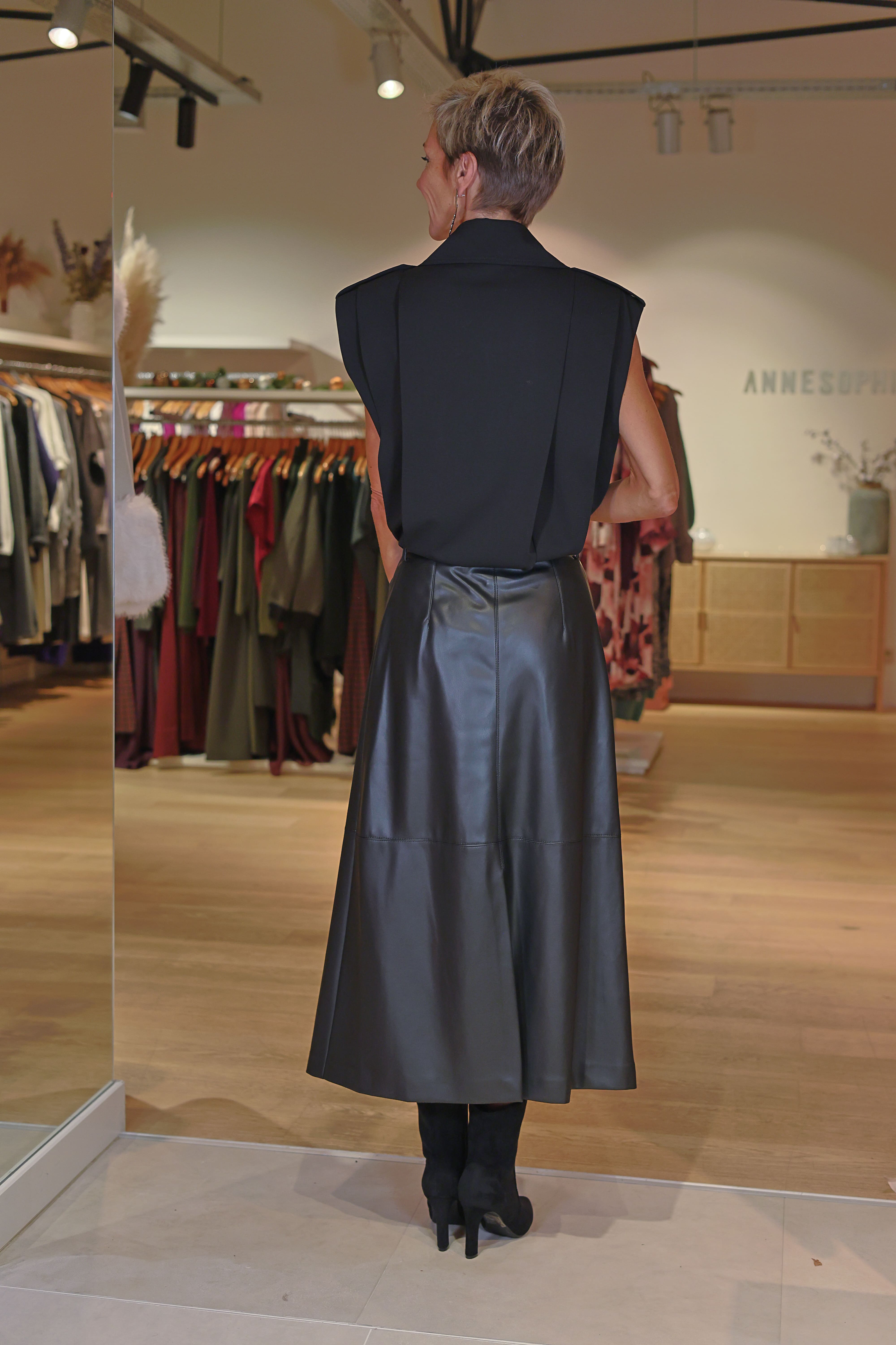 Icône de style, la jupe Manoé noire est un indispensable chic du dressing. Sa matière effet cuir lui confère un look moderne, tandis que sa coupe longue évasée offre un tombé impeccable. La ceinture noire assortie, dotée d’une élégante boucle ronde, marque délicatement la taille pour une allure féminine et structurée. Une pièce versatile, idéale en journée comme en soirée.
