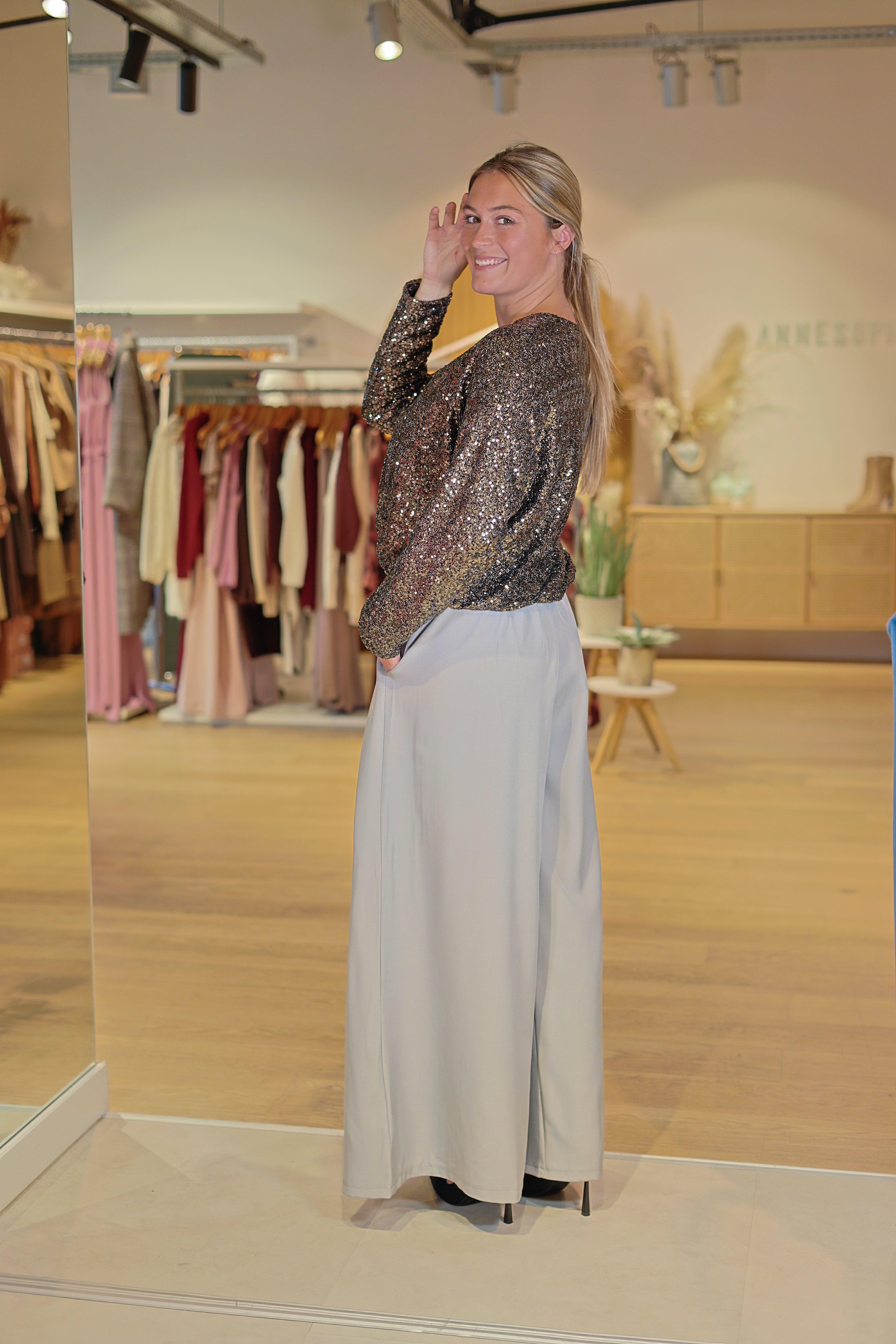 Le pantalon Mana gris incarne l’élégance décontractée. Sa coupe large et sa taille élastiquée dans le dos garantissent un confort parfait tout en allongeant la silhouette. Son tissu fluide au tombé impeccable apporte une touche chic et moderne, idéale pour vos looks du quotidien comme pour une soirée.