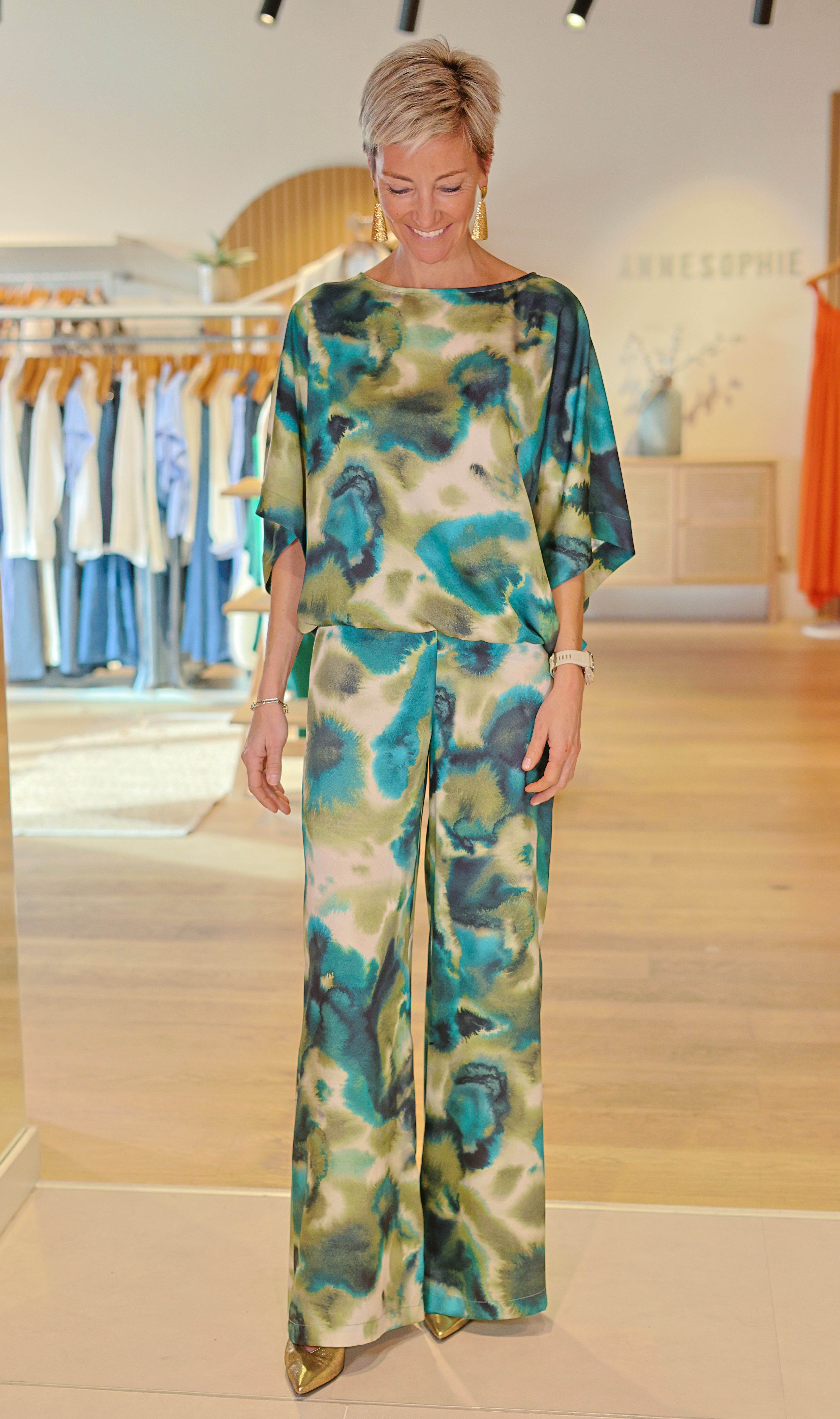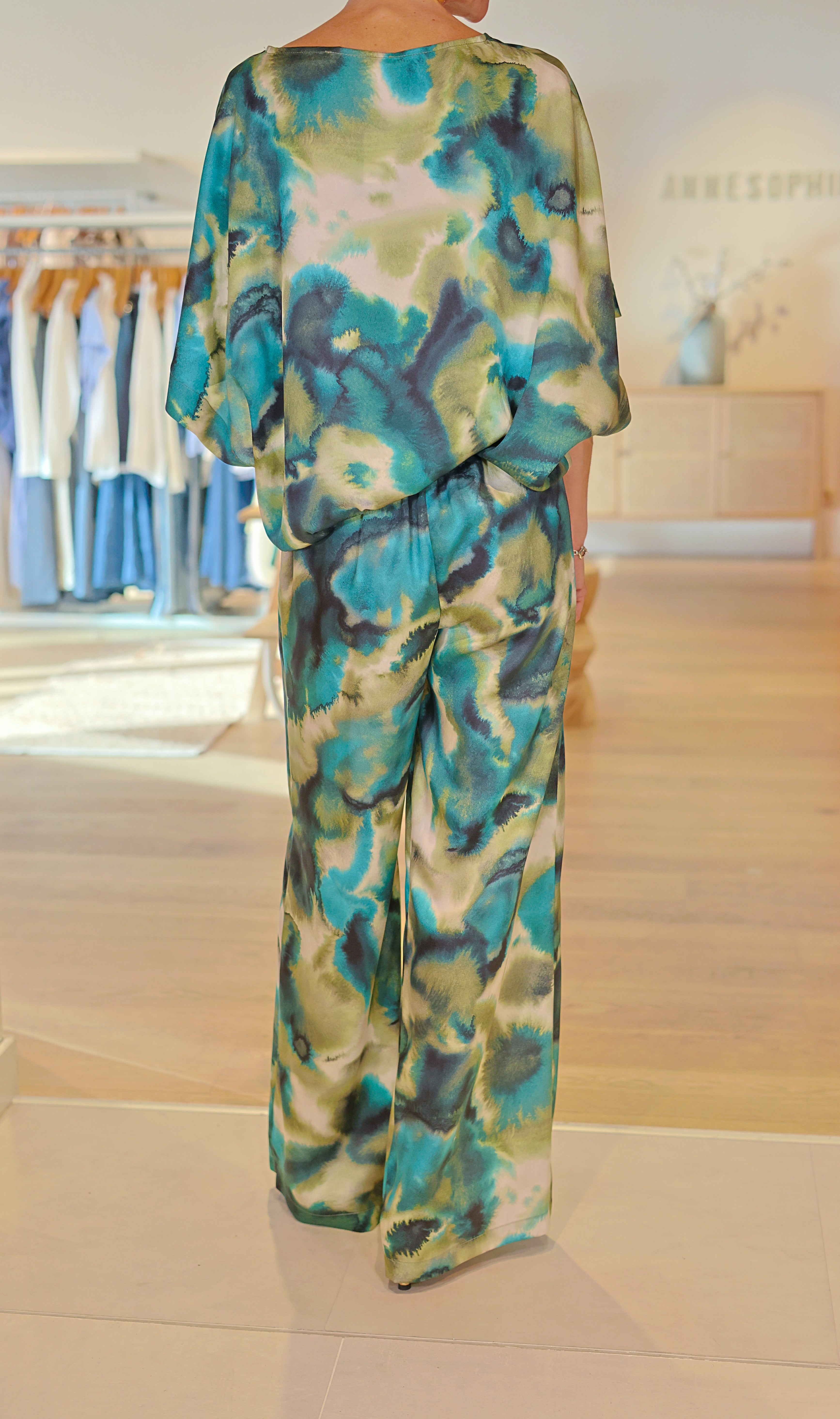 Le pantalon Angie est un pantalon fluide en 100% soie, au tombé léger et élégant. Son imprimé artistique dans des nuances de vert, turquoise et beige apporte une touche sophistiquée et moderne. Sa coupe droite et fluide allonge la silhouette tandis que la taille élastiquée garantit un confort absolu. Une pièce forte, idéale portée en total look ou associée à un haut uni.