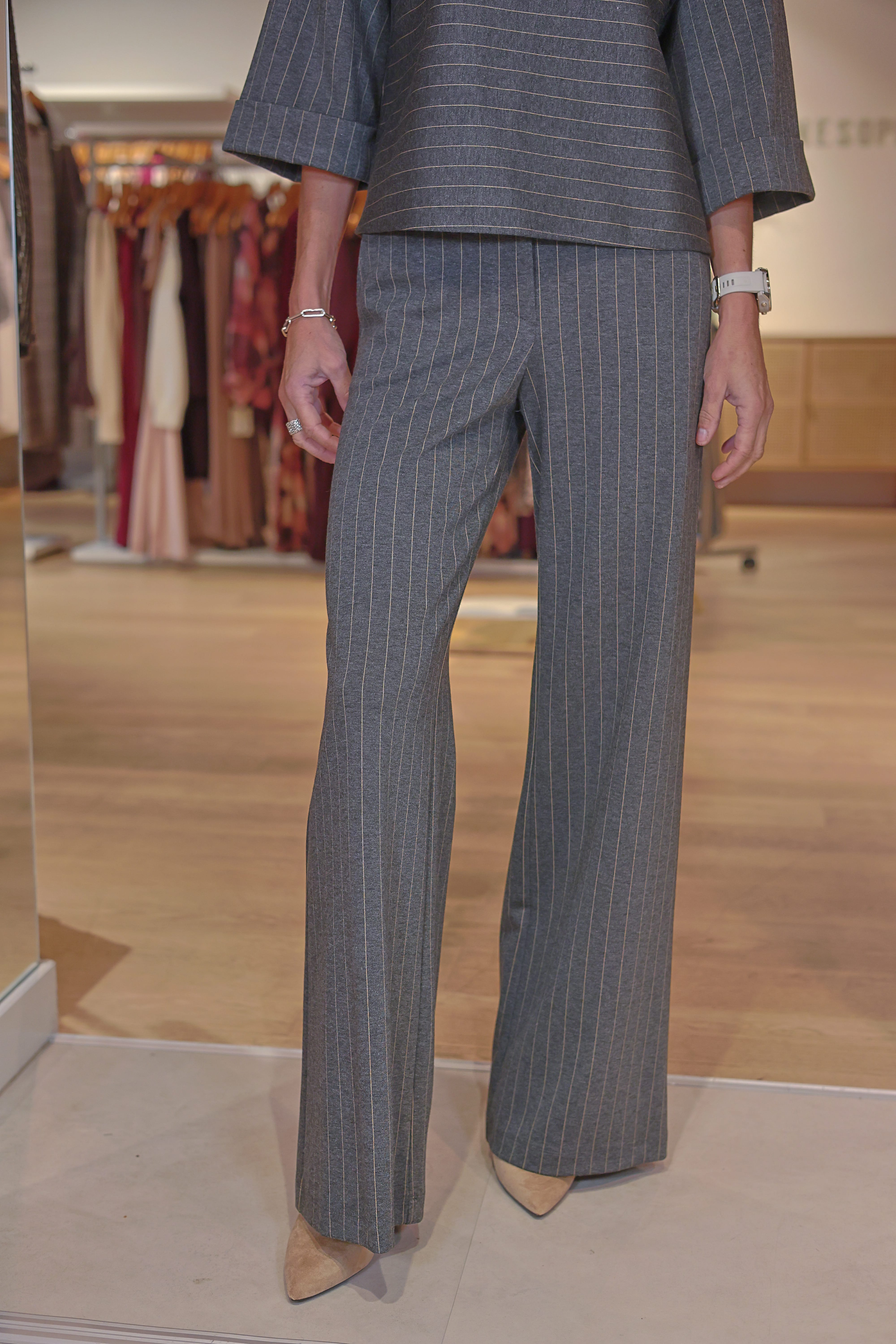 Le pantalon Gigi gris à fines rayures beiges revisite le style tailoring avec une touche contemporaine. Sa coupe large et fluide allonge la silhouette tout en offrant un confort optimal. Confectionné dans un tissu souple et légèrement extensible, il épouse le mouvement sans contrainte. Ses rayures verticales discrètes apportent une note élégante et allongent la jambe pour un effet silhouette élancée.