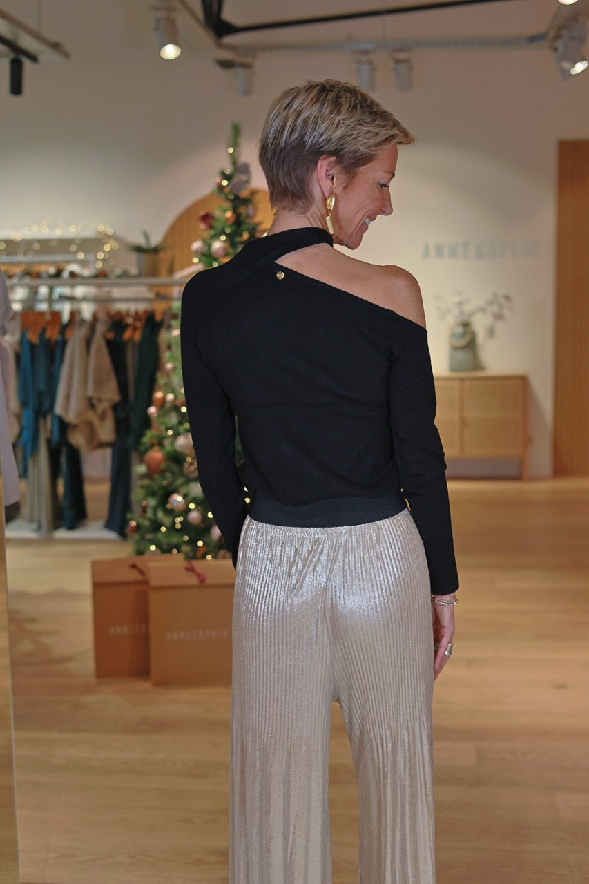 Le pull Iréna noir séduit par son allure moderne et sophistiquée. Avec son décolleté asymétrique dévoilant subtilement une épaule, il apporte une touche ultra féminine tout en restant élégant.