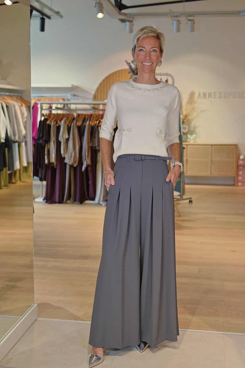 Le pull Maïwen blanc allie douceur et élégance dans un style résolument féminin. Sa maille fine et délicate est rehaussée de détails bijoux scintillants sur le col et les poches, pour une allure chic et lumineuse.