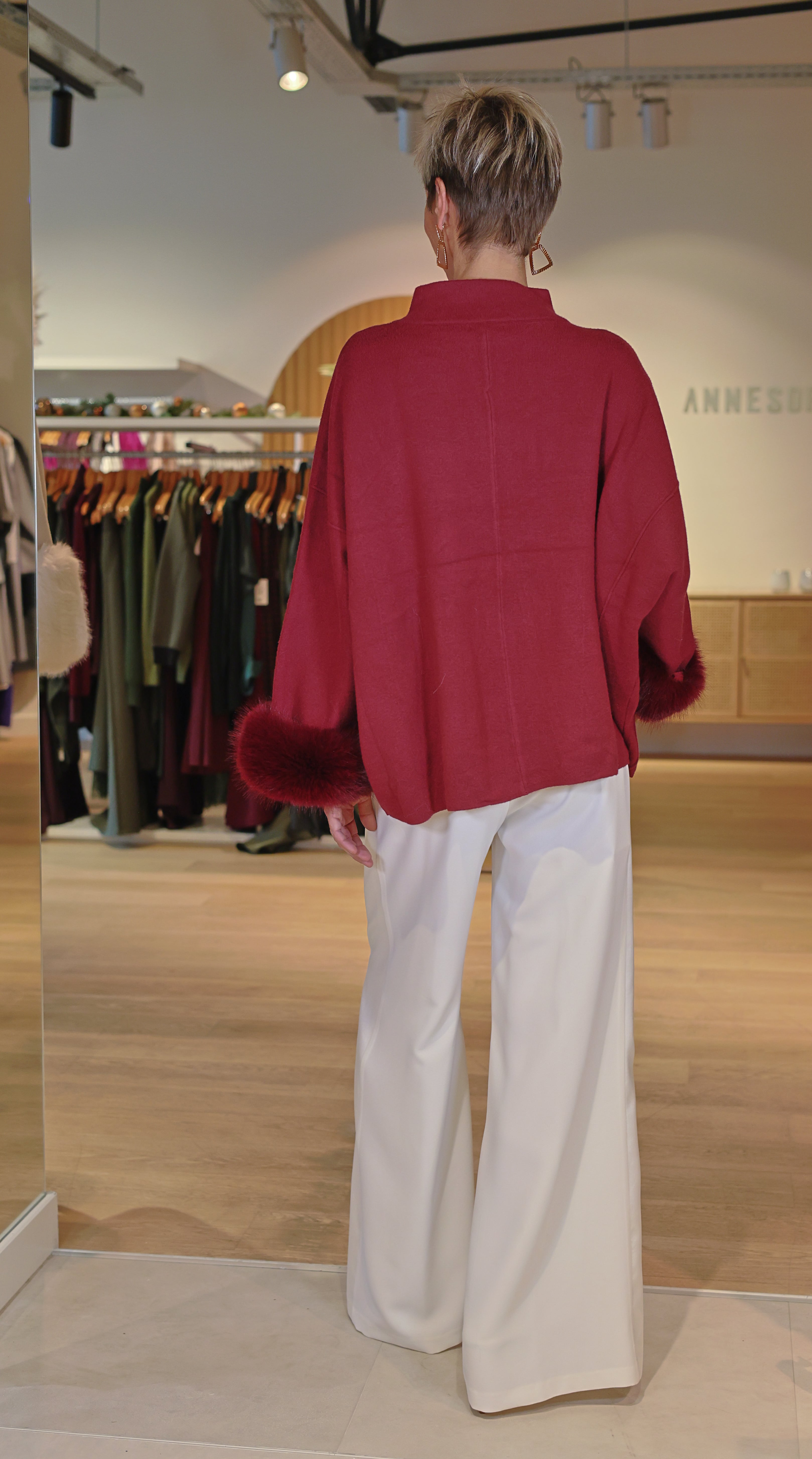 Le pull Mayla bordeaux apporte chaleur et sophistication grâce à sa teinte profonde et élégante. Sa coupe oversize et son col montant créent une silhouette féminine, tandis que les poignets en fourrure synthétique ton sur ton ajoutent une touche luxueuse. Une pièce forte pour un style chic sans effort.