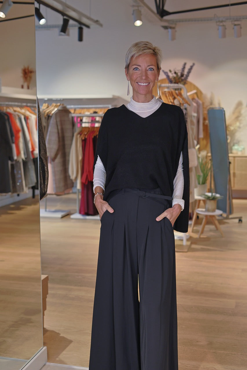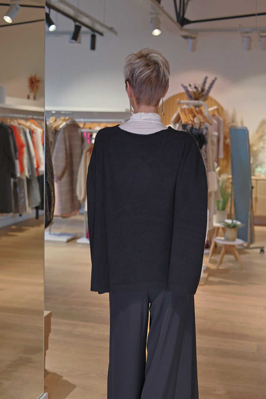 Le pull Thaïna noir incarne le chic intemporel. Son col V et sa maille fluide en font une pièce raffinée, facile à associer et idéale pour toutes les occasions.