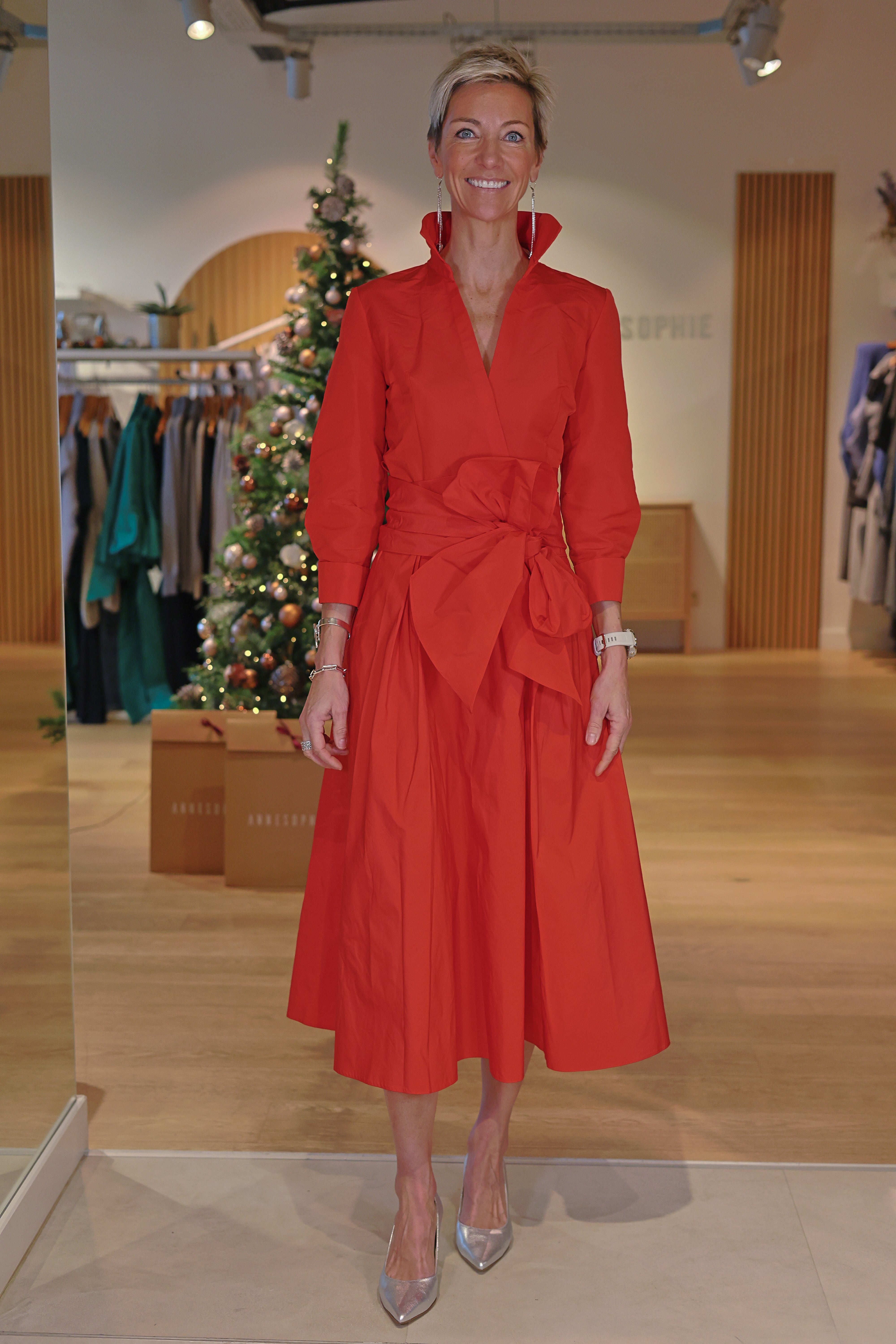 Anne-So porte une taille 38. Nous conseillons de prendre votre taille habituelle, voire une taille au-dessus, afin de ceinturer joliment la robe et d’obtenir un tombé parfait.