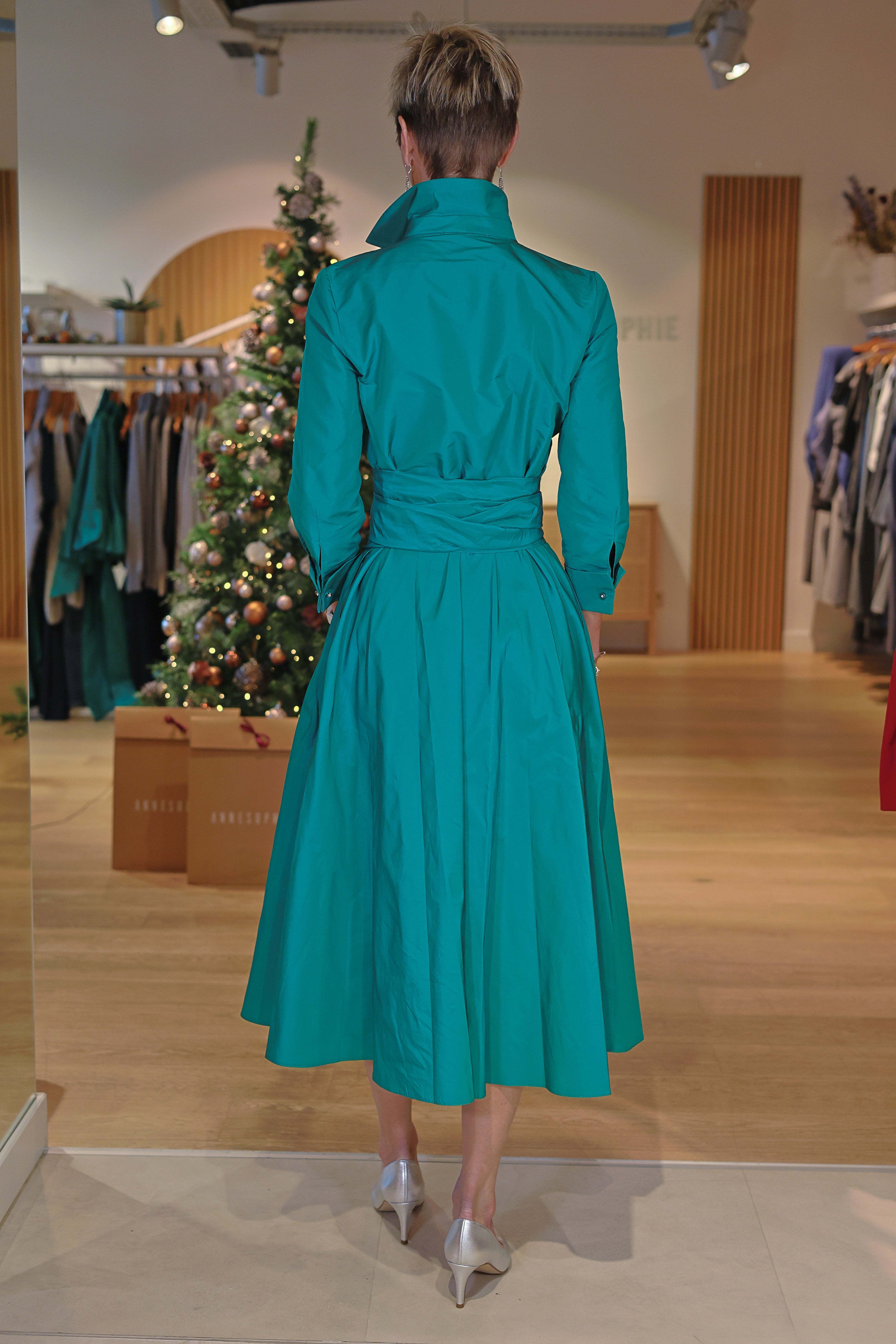 Élégante et lumineuse, la robe Laure vert turquoise en taffetas est idéale pour les grandes occasions comme pour un look chic assumé. Sa matière apporte une structure raffinée tout en conservant une belle légèreté. Grâce à sa doublure intégrale, elle assure un confort parfait. La ceinture ton sur ton permet d’ajuster la taille et de sublimer la silhouette avec élégance.