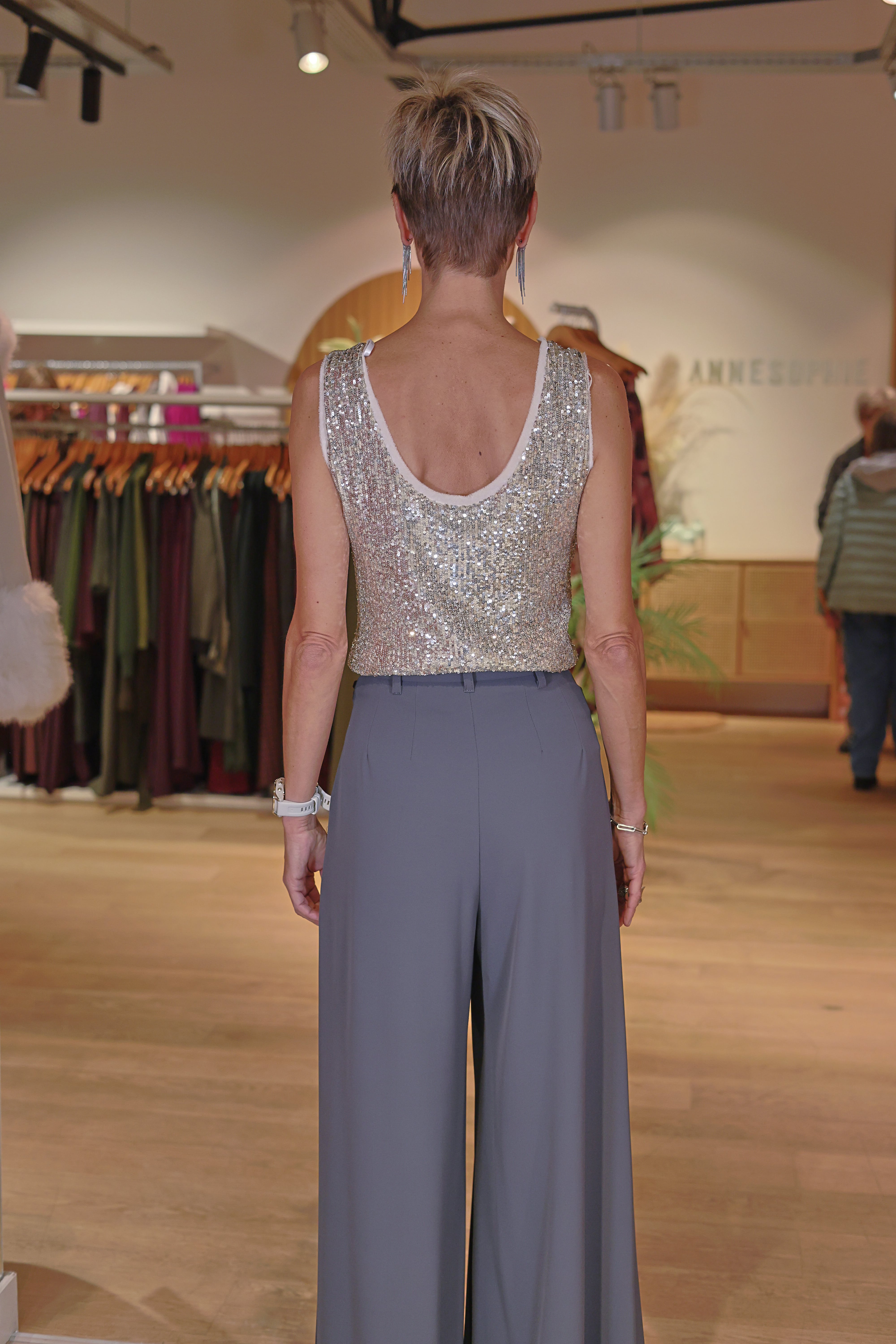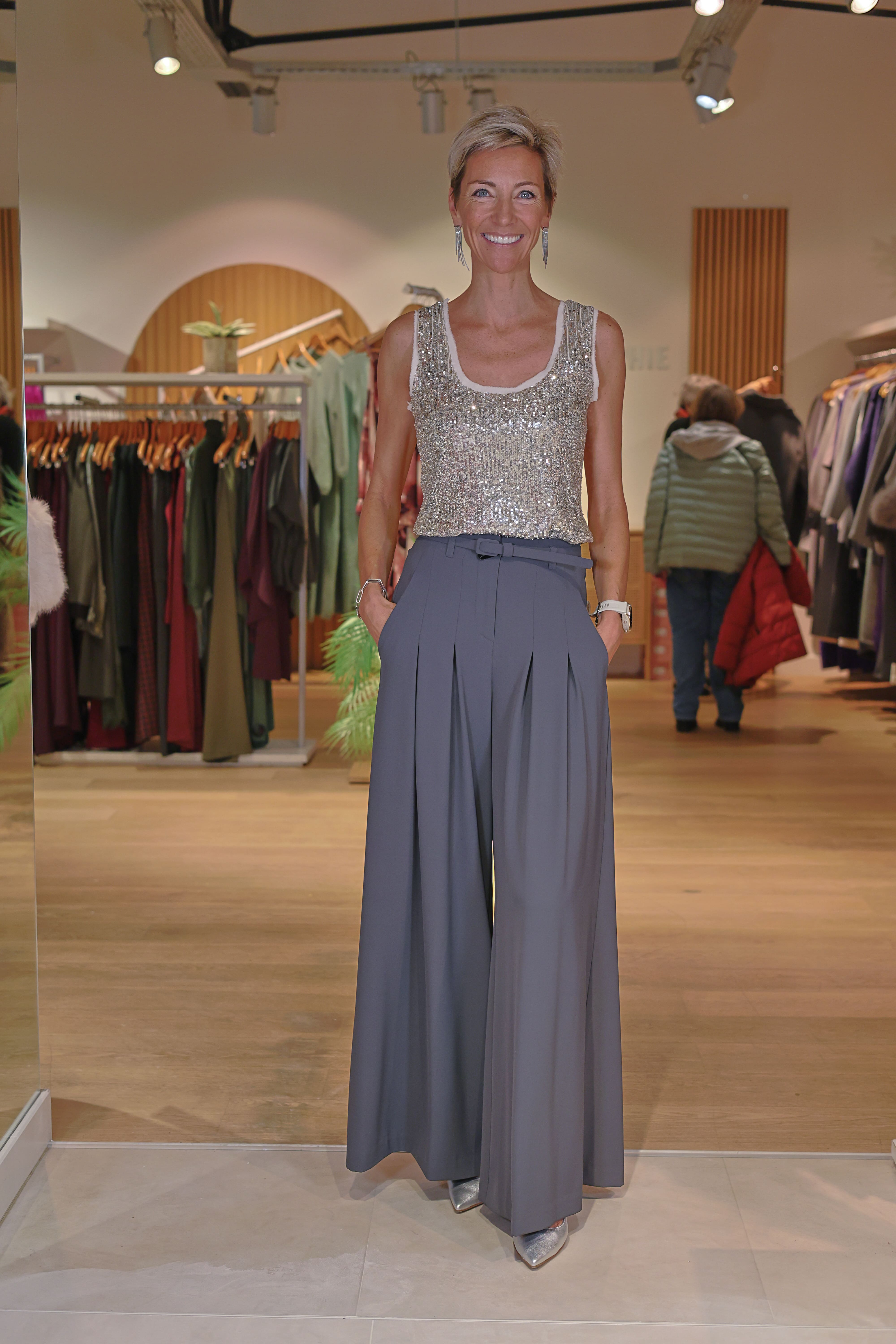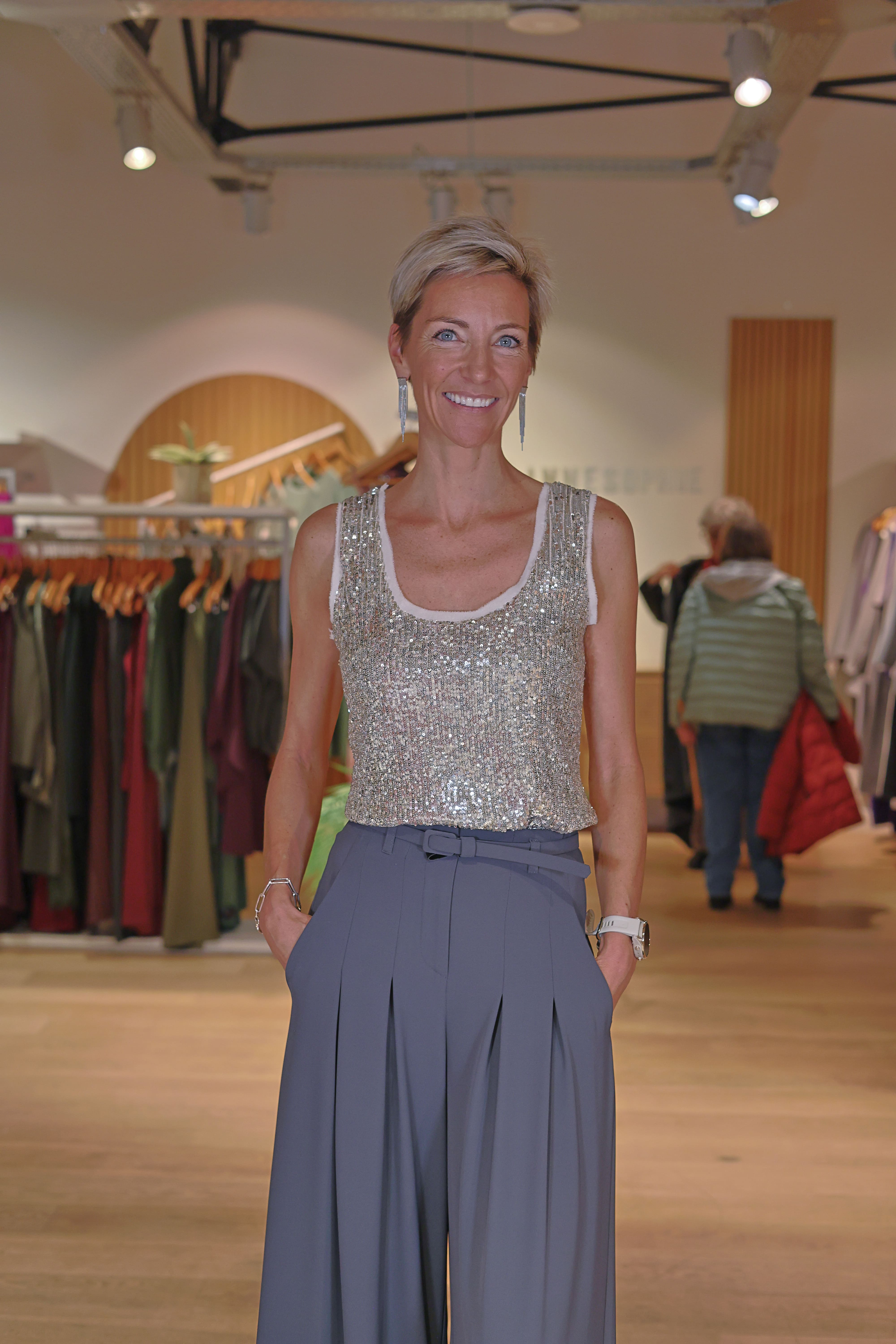 Le Top Katarina argenté illumine instantanément la silhouette grâce à son tissu entièrement recouvert de paillettes scintillantes. Sa coupe sans manches et son décolleté arrondi modernisent l’allure tout en restant élégants. Parfait pour une soirée, un événement ou simplement pour ajouter une touche glamour à une tenue du quotidien.