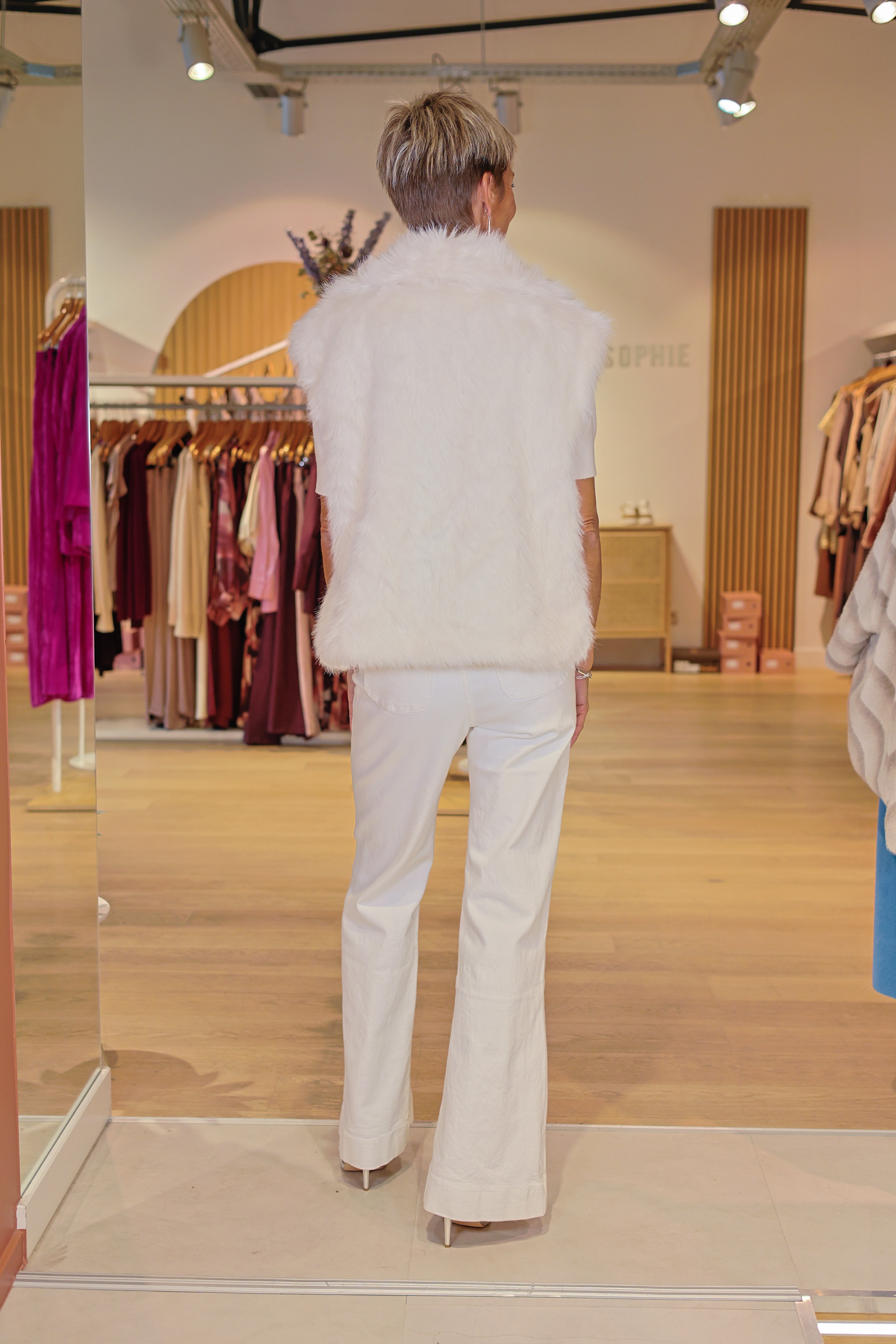 La veste Opaline blanche en fausse fourrure incarne le chic absolu et la modernité hivernale. Sa texture duveteuse et son blanc éclatant apportent une note lumineuse et sophistiquée à vos looks. Parfaite pour une sortie élégante ou une allure casual raffinée, cette veste sans manches se porte aussi bien sur une chemise, un col roulé ou une robe ajustée.