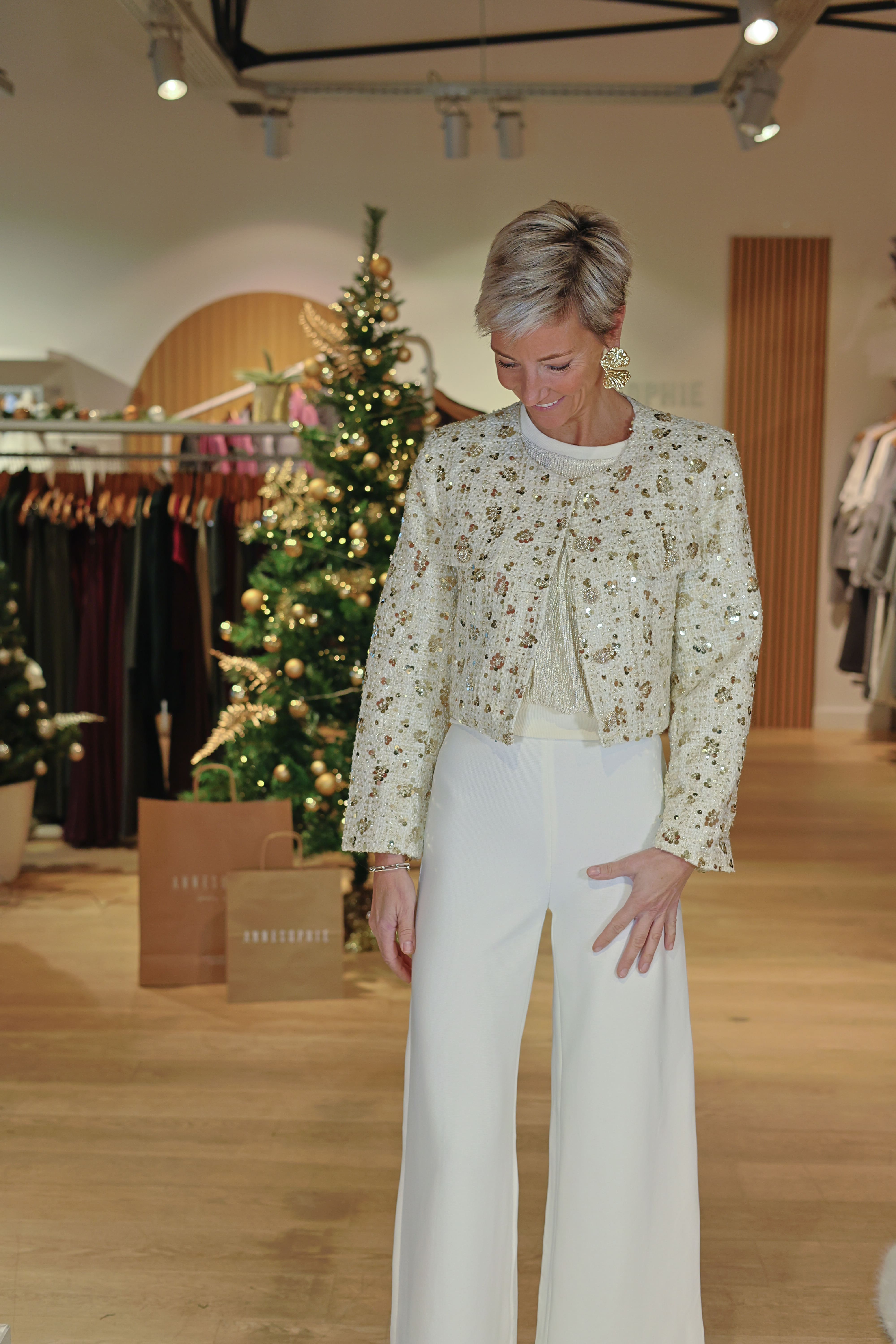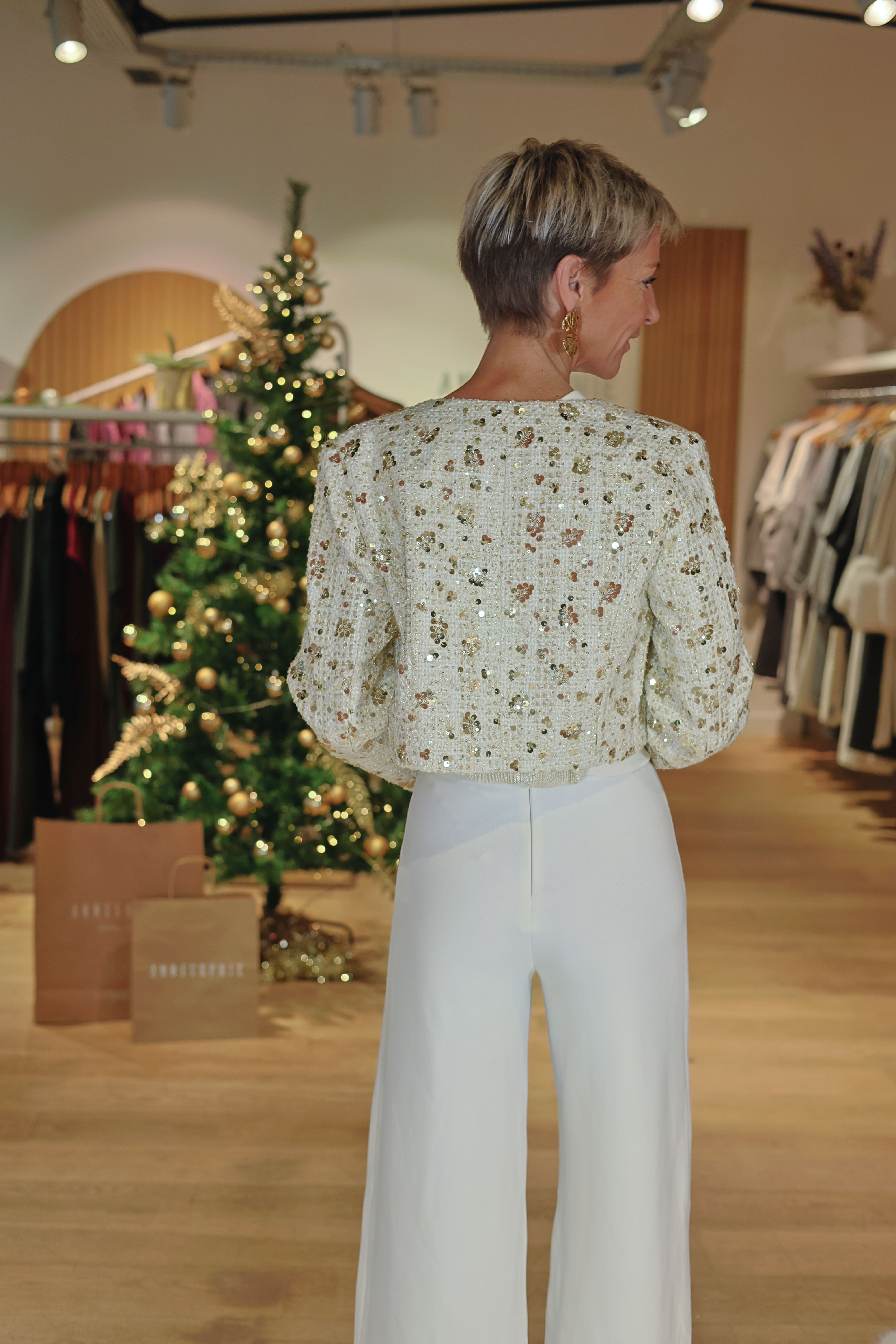 La veste Petra est une pièce d’exception qui illumine instantanément n’importe quelle tenue. Entièrement brodée de fils dorés et de sequins, elle combine élégance, modernité et esprit couture. Sa coupe courte structure la silhouette et met en valeur la taille, tandis que son tissu travaillé apporte une touche festive irrésistible.